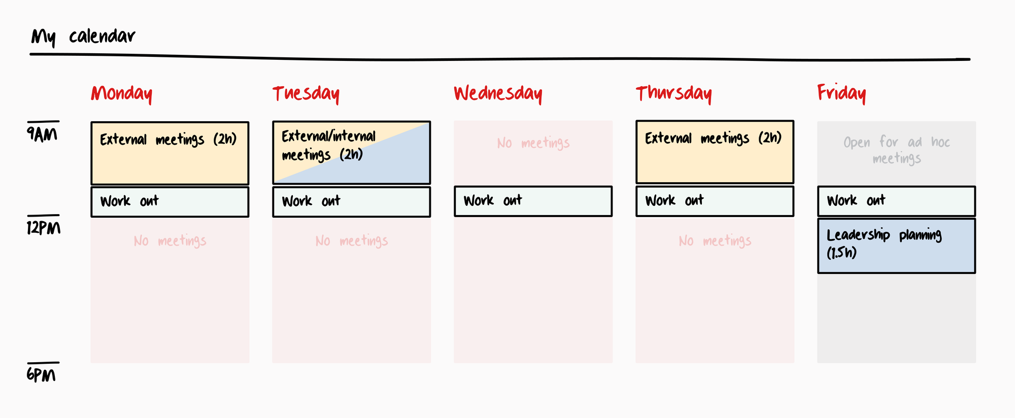 - Meeting blocks. Schedule in blocks to limit context switching.