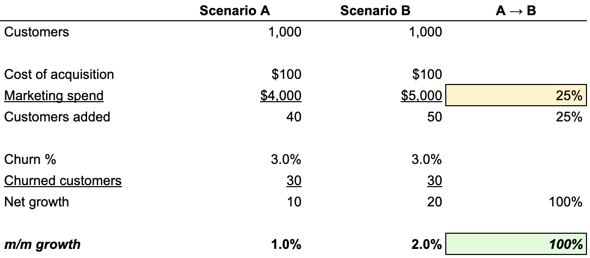 When you reach a certain absolute scale, growth compounds. Consider the example below in which a 25% increase in marketing doubles growth.